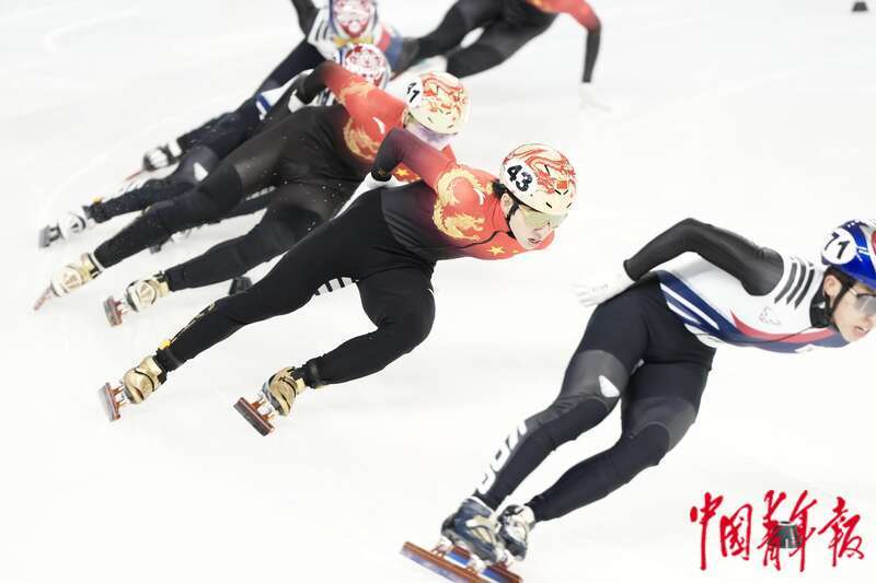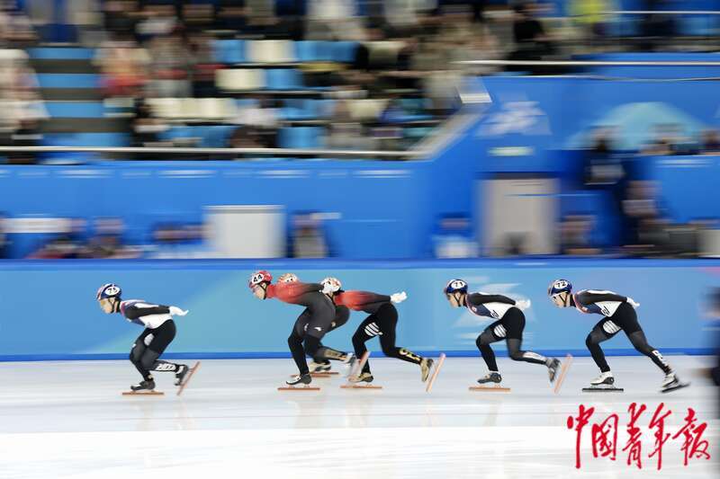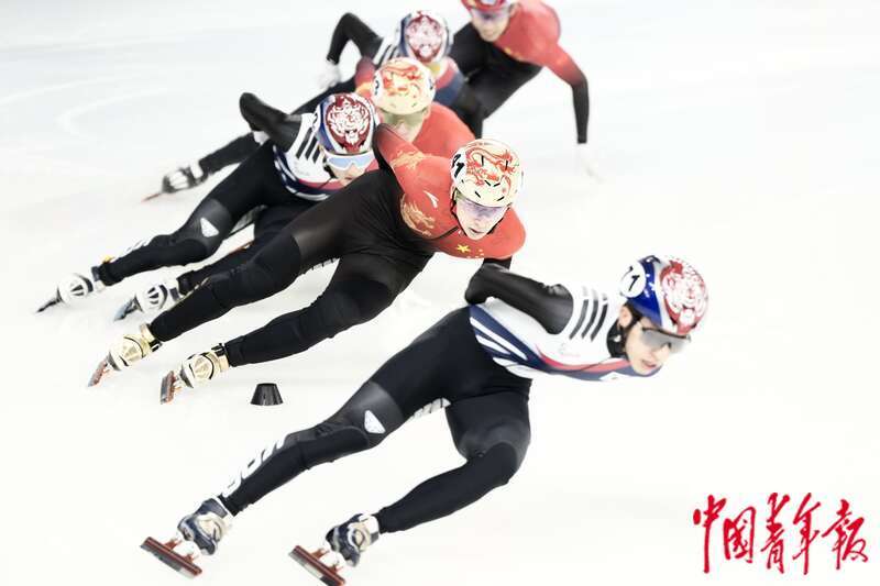 2月8日,黑龙江哈尔滨,第九届亚冬会短道速滑男子1500米决赛中,各国选手在赛道上竞逐。中青报·中青网记者 李隽辉/摄