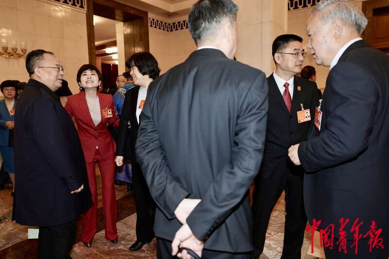 3月5日,北京,人民大会堂,第十四届全国人民代表大会第三次会议开幕会开始前,代表委员们互相交流。中青报·中青网记者 李隽辉/摄