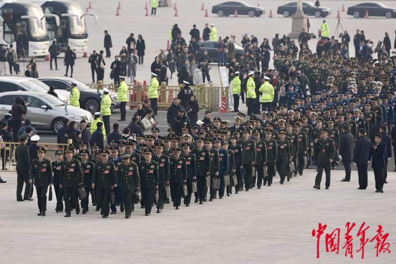 3月5日,北京,人民大会堂外,第十四届全国人民代表大会第三次会议即将开幕,解放军和武警部队代表团整齐列队进入会场。中青报·中青网记者 李隽辉/摄