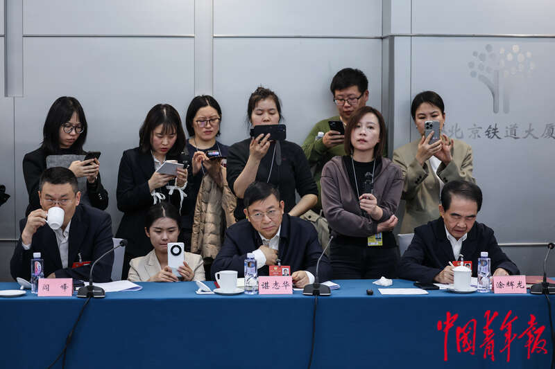 3月5日,北京铁道大厦,全国政协十四届三次会议经济界别小组会议上,记者们在委员身后拍摄。中青报·中青网记者 曲俊燕/摄
