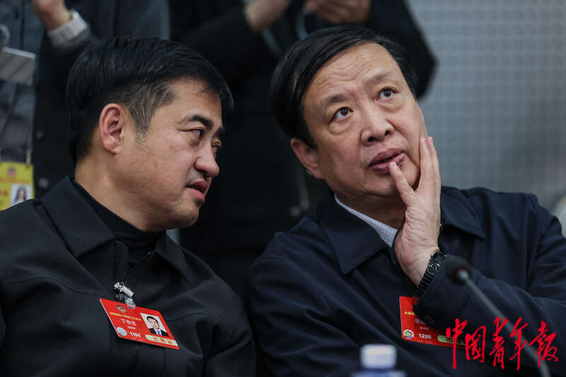 3月5日,北京铁道大厦,全国政协十四届三次会议经济界别举行小组会议,全国政协常委、全国工商联副主席、安踏集团董事局主席丁世忠(左)与全国政协委员,国家烟草专卖局党组书记、局长张建民在会上交流。中青报·中青网记者 曲俊燕/摄