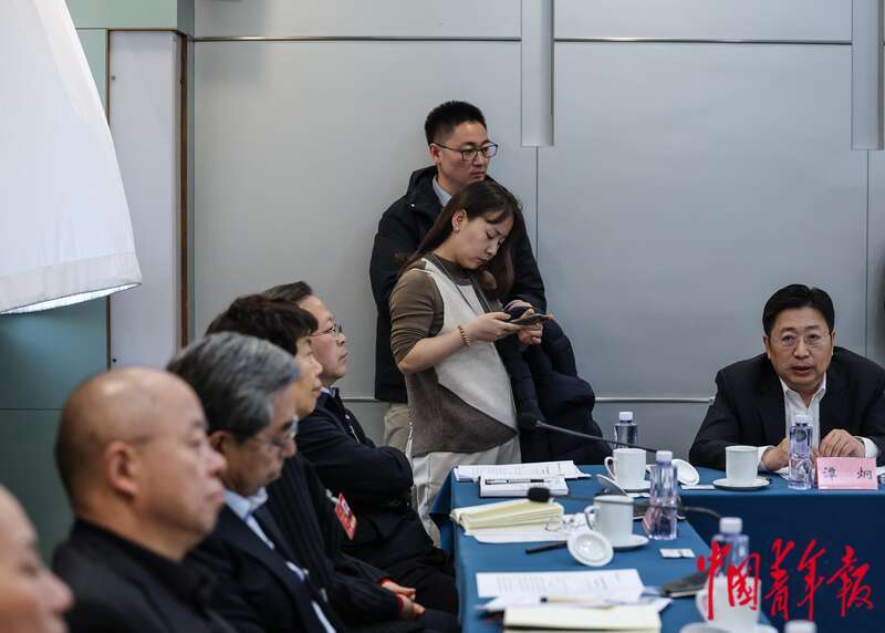 3月5日,北京铁道大厦,全国政协十四届三次会议经济界别举行小组会议,全国政协委员、国家开发银行行长谭炯(右一)发言时,一阵风吹进会场。中青报·中青网记者 曲俊燕/摄