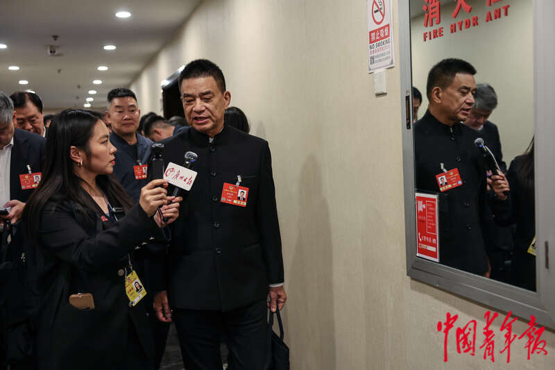 3月5日,北京铁道大厦,全国政协十四届三次会议经济界别当天的小组会议结束后,全国政协委员、新希望集团董事长刘永好(右)在离开会场时接受记者采访。刘永好已连续7届以人大代表或政协委员身份参加全国两会。中青报·中青网记者 曲俊燕/摄
