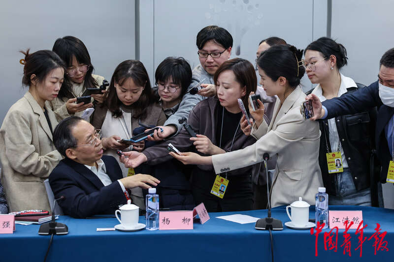 3月5日,北京铁道大厦,全国政协十四届三次会议经济界别当天的小组会议结束后,一名记者在会场外的安静角落采访全国政协委员、申万宏源证券研究所首席经济学家杨成长(左)。中青报·中青网记者 曲俊燕/摄