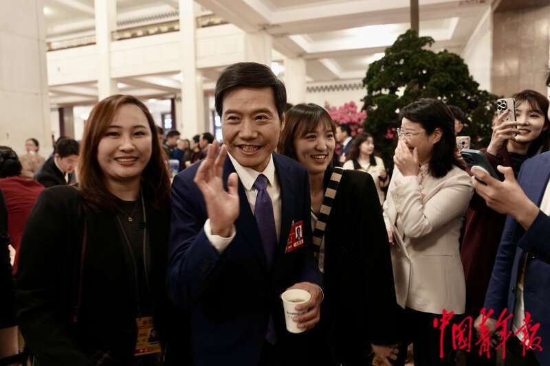 3月11日,北京,人民大会堂,十四届全国人大三次会议闭幕会开始前,全国人大代表雷军被记者围堵。今年全国两会,雷军围绕新能源汽车、人工智能产业的高质量发展,向大会提交了五份建议。中青报·中青网记者 李隽辉/摄