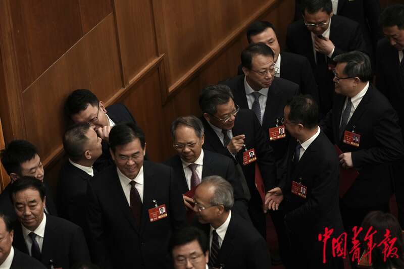 3月11日,北京,人民大会堂,十四届全国人大三次会议闭幕会开始前,在主席台就座的代表们陆续入场,彼此交流。中青报·中青网记者 李隽辉/摄