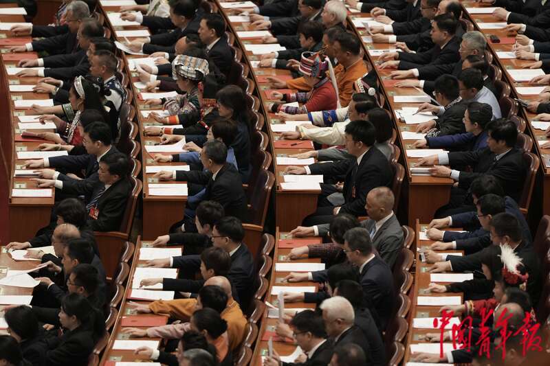 3月11日,北京,人民大会堂,十四届全国人大三次会议闭幕会上,代表们进行表决。中青报·中青网记者 李隽辉/摄
