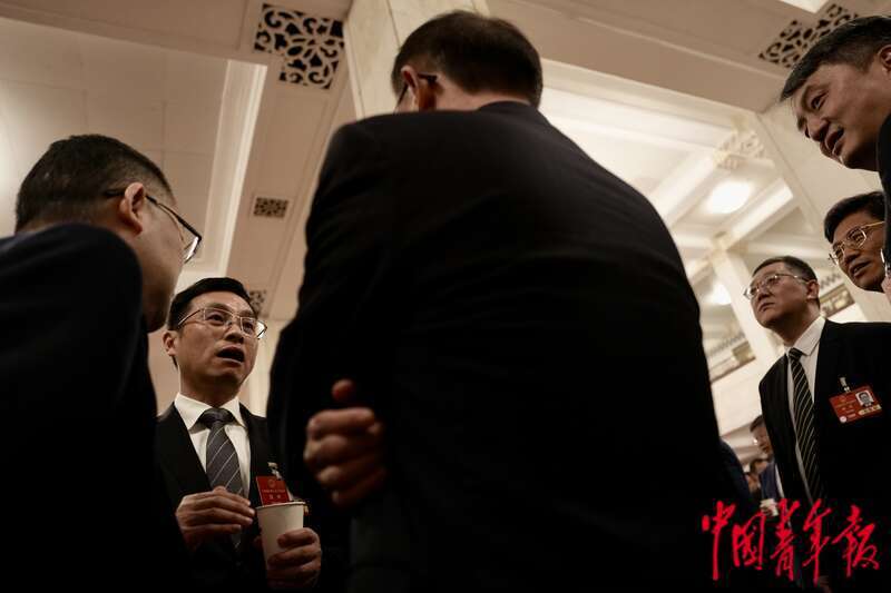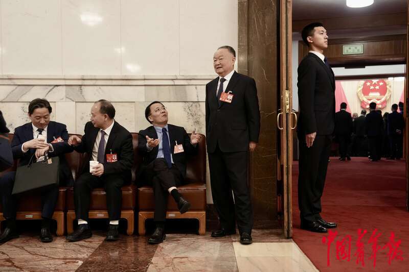 3月11日,北京,人民大会堂,十四届全国人大三次会议闭幕会开始前,代表们在大会堂一层大厅交流。中青报·中青网记者 李隽辉/摄