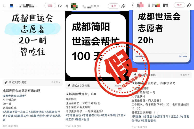 有网民在互联网社交平台假借“成都世运会志愿者”名义,发布不实兼职招聘信息。图源网络