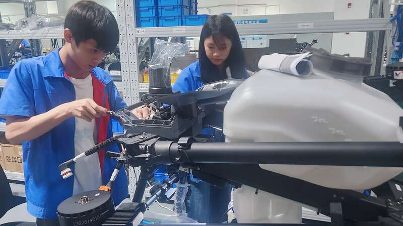 6月26日,广东省深圳市,在深圳市联合飞机科技有限公司的生产车间,工作人员们正手拿零部件合力组装无人机产品。中青报·中青网记者 魏婉/摄