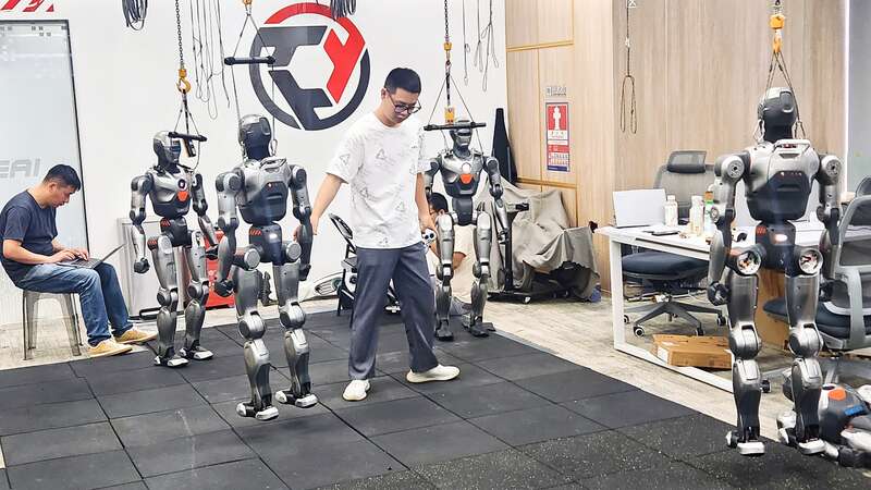6月25日,广东省深圳市,在深圳“机器人谷”,深圳市众擎机器人科技有限公司的工作人员正在对人形机器人产品进行测验。中青报·中青网记者 魏婉/摄