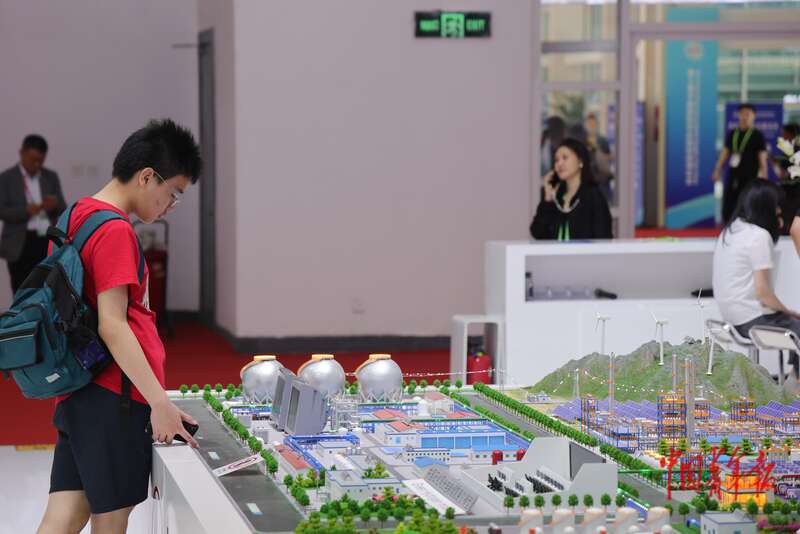 7月17日,北京,中国国际展览中心(顺义馆),第三届链博会清洁能源链展区,中国石化展台,观众观看风光电制氢沙盘模型,该模型展示用风力、光伏发电,将水电解产生氢能源过程。据介绍,该套设施工程氢能年产量最高2万吨,年减排二氧化碳48.5万吨。陈思阳/摄