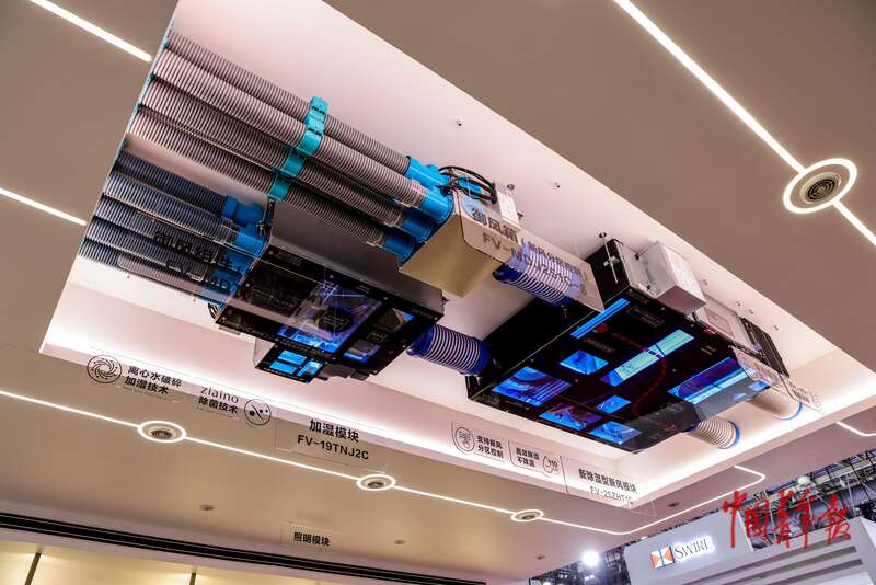 7月17日,北京,中国国际展览中心(顺义馆),第三届链博会健康生活链展区,一家电子电器品牌展台上展示的全屋空气环境管理系统。该系统拥有新风、空调、调湿、除菌四大功能,与一般空调换气系统相比长期能耗可降低58%。陈思阳/摄