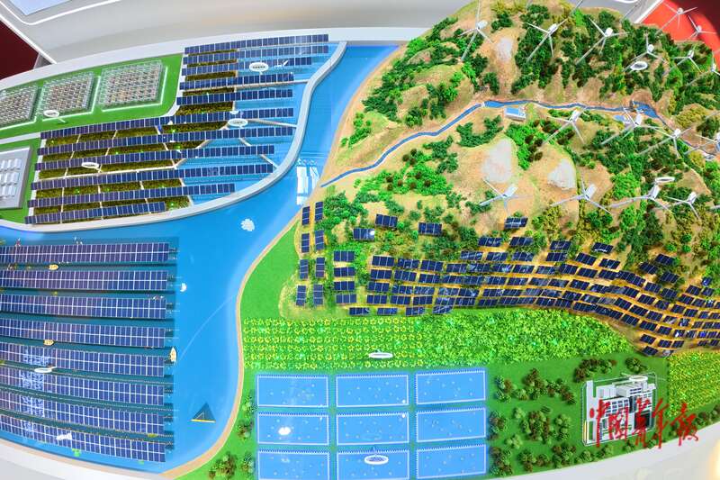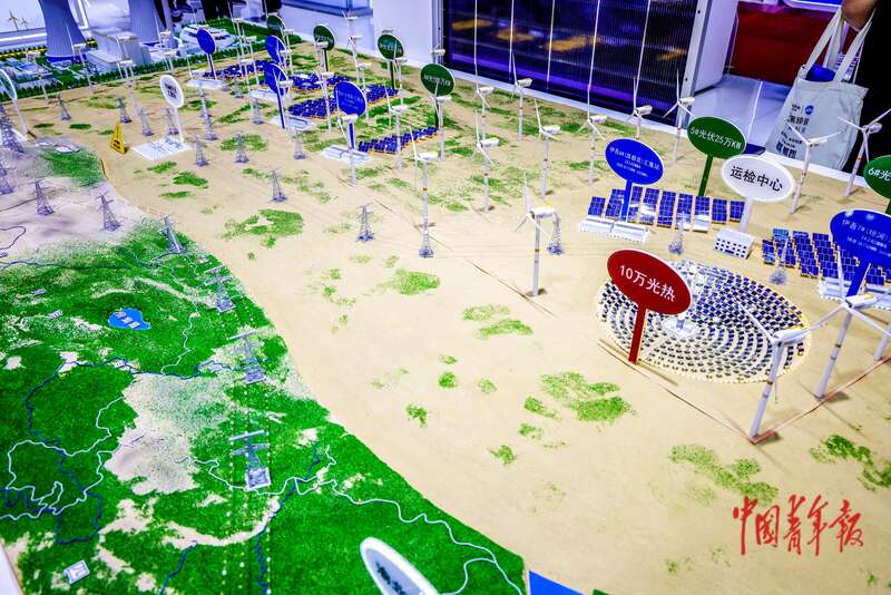 7月17日,北京,中国国际展览中心(顺义馆),第三届中国国际供应链促进博览会(以下简称“链博会”)清洁能源链展区,在华润电力展台上展示了“疆电入渝”配套电源项目的沙盘模型。据介绍,该项目由华润集团和中国华电共同建设,通过风力、光伏、光热、火电多种方式转化成电能,每年向重庆输送电能超191亿千瓦时,其中清洁能源占比50%以上,每年可减排二氧化碳761万吨。陈思阳/摄
