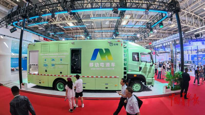 7月17日,北京,中国国际展览中心(顺义馆),第三届链博会智能汽车链展区中展示的移动电源车。该车是全球首个醇氢电动移动充电车,可同时给4辆电动车不间断供电24小时以上。陈思阳/摄