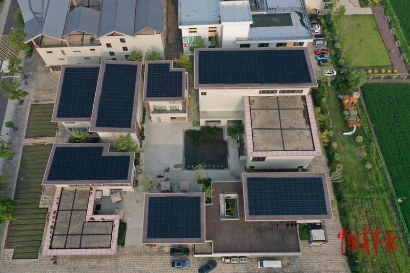 8月4日,浙江省杭州市萧山区瓜沥镇梅林村,从空中俯瞰梅林村的社区服务中心——美好生活中心。其屋顶上配备的这套“光伏+储能”系统,年发电量超16万千瓦时,可减少二氧化碳排放约94吨。(无人机照片)中青报·中青网记者 孔斯琪/摄