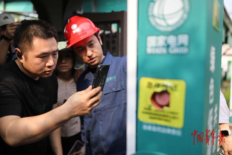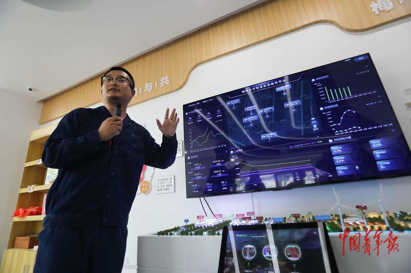 8月4日,浙江省杭州市萧山区瓜沥镇梅林村,国家电网杭州供电公司零碳工程师来涵彬向来宾讲解梅林村的乡村智慧能源服务平台。平台分为共富电单、绿色生活、工业降碳等几个模块,从系统可以看到梅林村总的光伏发电情况、储能情况、充电站情况和节能减排情况。历年数据显示,梅林村的总减排量已经达到598.58吨,基于中国林业通用标准相当于等效植树32000棵。中青报·中青网记者 孔斯琪/摄