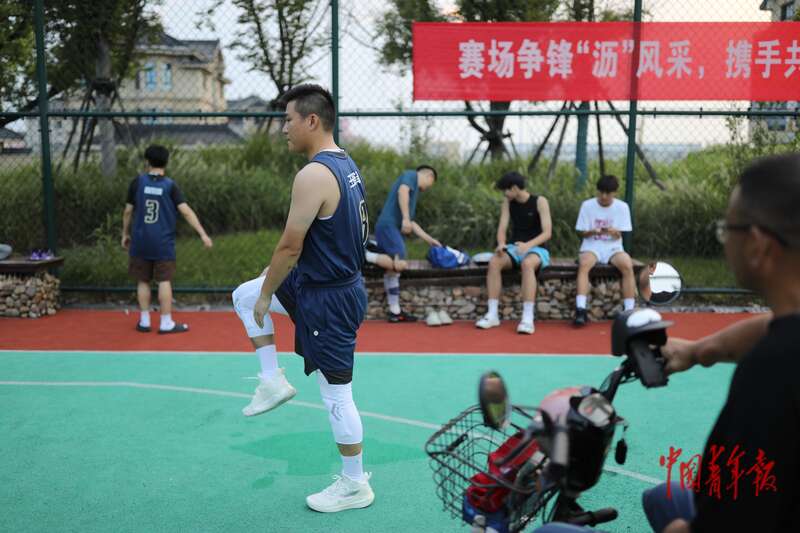 8月4日,浙江省杭州市萧山区瓜沥镇梅林村,一场村超比赛即将开始,来自邻村球队的年轻人正在热身准备。中青报·中青网记者 孔斯琪/摄