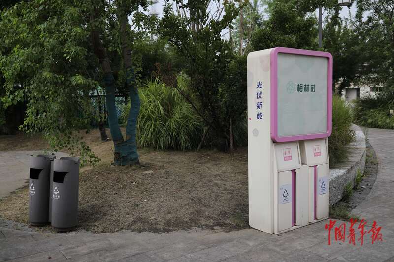 8月4日,浙江省杭州市萧山区瓜沥镇梅林村,光充储一体化停车场旁的垃圾桶上写着“光伏新能”的字样。在梅林村,低碳的新生活方式体现在方方面面。中青报·中青网记者 孔斯琪/摄