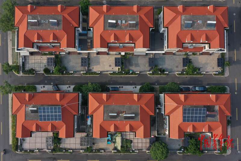 8月4日,浙江省杭州市萧山区瓜沥镇梅林村,村民住宅屋顶上的光伏板。梅林村位于萧山东部,村域面积1.88平方公里,是“千万工程”源起地之一。近年来,这里正以光伏发电为核心,全力打造可持续、高质量发展的“低碳乡村”。据梅林村党委书记杨燕江介绍,村里有60余户民居安装了光伏板,除了满足日常用电,还能把多余的电卖出去,平均每户每月增收200元左右。(无人机照片)中青报·中青网记者 孔斯琪/摄