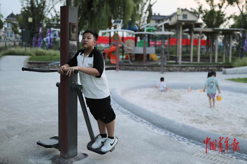 8月4日,浙江省杭州市萧山区瓜沥镇梅林村,一名小朋友在乡村公园中锻炼身体。这里的许多健身器材都内置智能系统,可以将消耗的卡路里等实时数据呈现在屏幕上。中青报·中青网记者 孔斯琪/摄