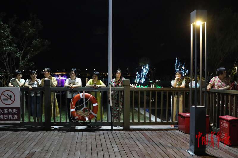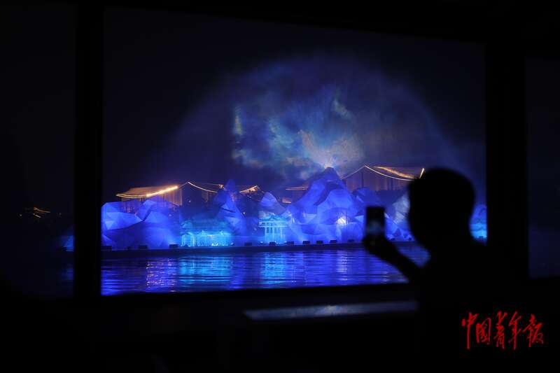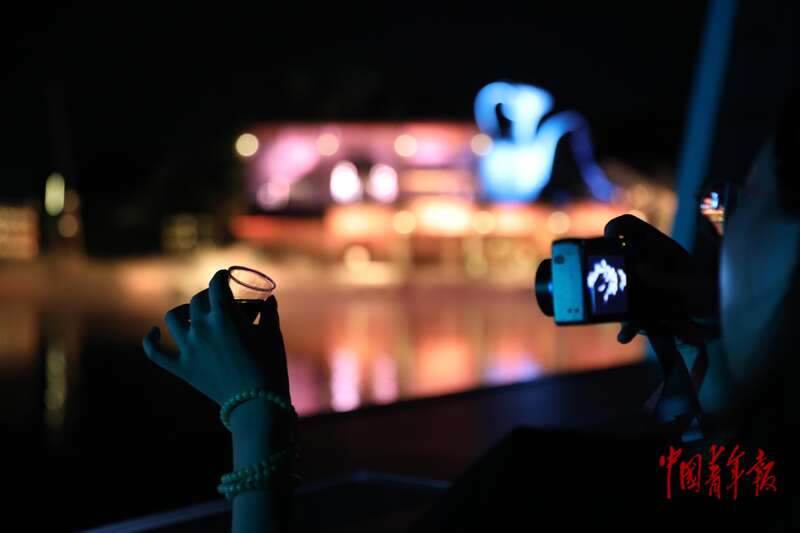 8月8日,浙江省绍兴市越城区,游客在船上欣赏讲述大禹治水故事的灯光秀。中青报·中青网记者 孔斯琪/摄