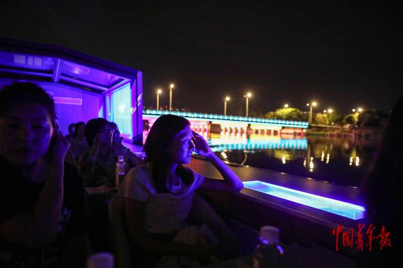 8月8日,浙江省绍兴市越城区,游客在船上欣赏古运河夜景。中青报·中青网记者 孔斯琪/摄