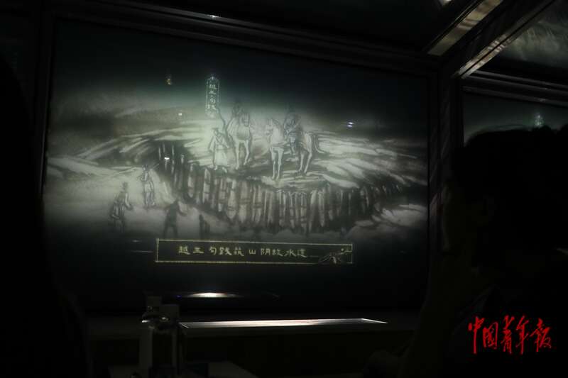 8月8日,浙江省绍兴市越城区,游船上讲述越王勾践在越地卧薪尝胆、兴修水利、发展农业的动画投影。中青报·中青网记者 孔斯琪/摄