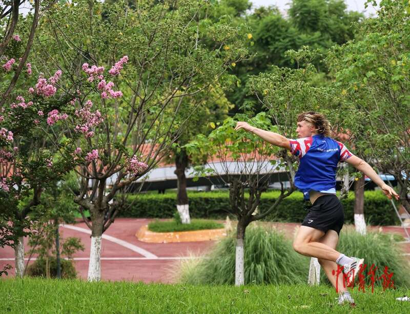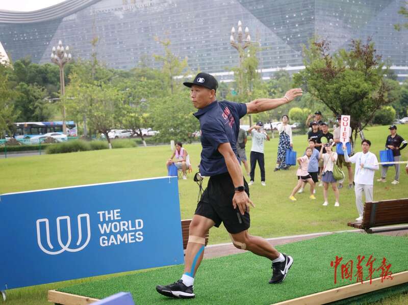 8月8日下午,成都世运会掷准飞盘比赛中,英国选手Ben Holding正在比赛。飞盘既是一项运动,也是受到人们喜爱的游戏。此次比赛的赛场桂溪生态公园,日常就有很多市民在这里玩飞盘。中青报·中青网记者 王鑫昕/摄