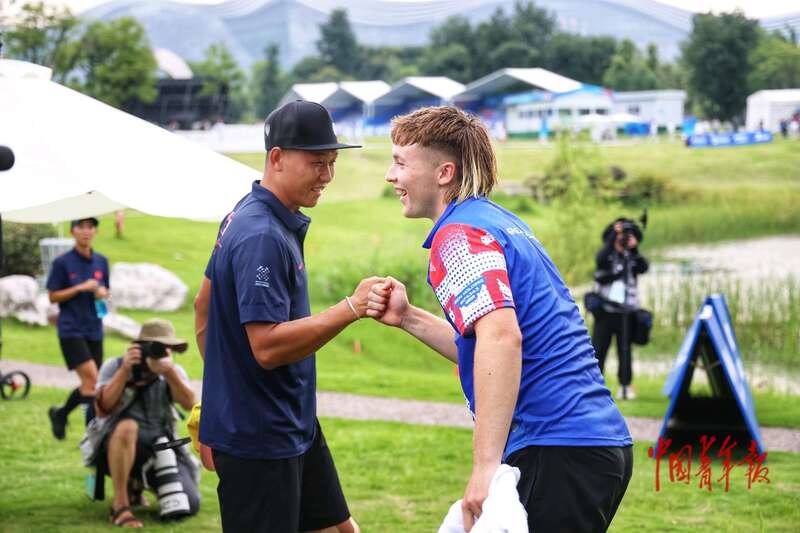 8月8日下午,成都世运会掷准飞盘比赛中,中国选手赵辰菲(左)和英国选手Ben Holding(右)击拳致意。中青报·中青网记者 王鑫昕/摄