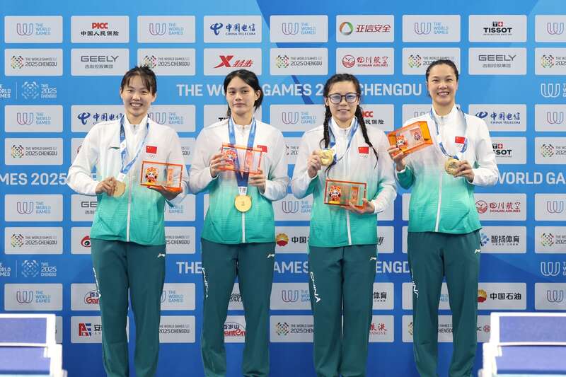 8月10日,冠军中国队选手胡瑶瑶、舒程静、谢文敏、许艺川在2025年成都世运会女子4x100米水面蹼泳接力颁奖仪式上。新华社记者 张丽芸 摄