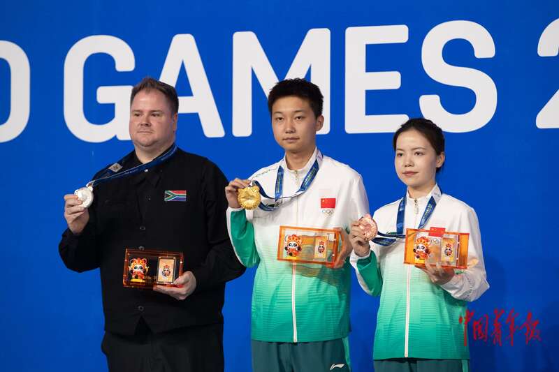 8月14日,成都世运会台球八球混合决赛后的颁奖仪式,获得金银铜牌的中国选手张泰艺(中)、南非选手塞龙(左)、中国选手唐春晓合影留念。汪龙华/摄