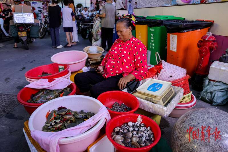 8月18日,福建省泉州市蟳埔民俗文化村,晚上,蟳埔女售卖当天刚捕捞上来的海产品。中青报·中青网见习记者 陈思阳/摄