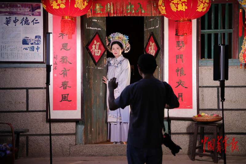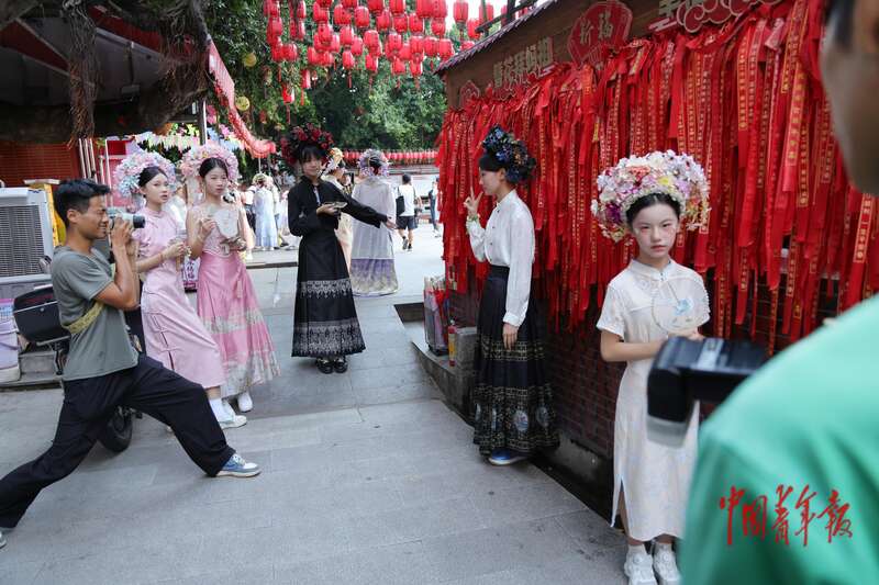 8月18日,福建省泉州市蟳埔民俗文化村,旅拍摄影师为游客拍照。中青报·中青网见习记者 陈思阳/摄