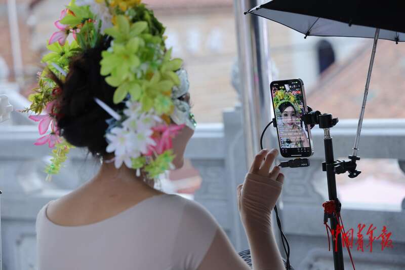 8月18日,福建省泉州市蟳埔民俗文化村,年轻人通过网络直播售卖簪花文创。中青报·中青网见习记者 陈思阳/摄
