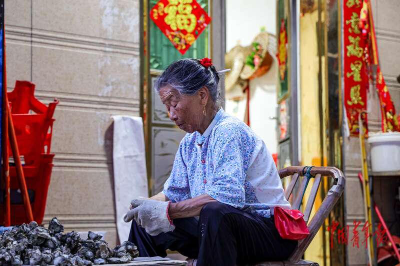 8月18日,福建省泉州市蟳埔民俗文化村,当地年长的蟳埔女在家门口劳作。中青报·中青网见习记者 陈思阳/摄