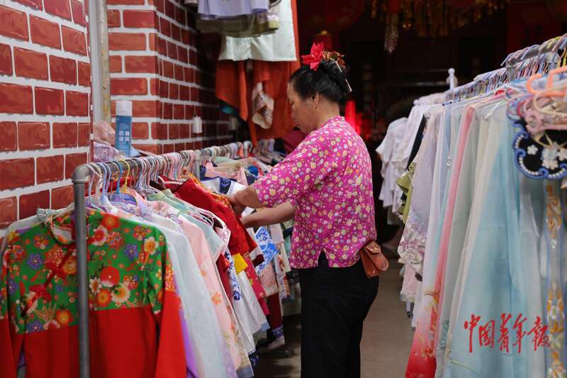 8月18日,福建省泉州市蟳埔民俗文化村,一家旅拍店内,店家正在整理服装,这里大部分的服装都是蟳埔女服饰、马面裙等具有中国传统特色的服饰。中青报·中青网见习记者 陈思阳/摄