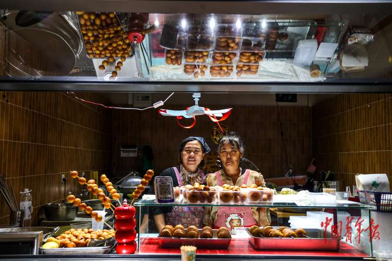 7月29日,内蒙古包头市“天下黄河第一村”,一家黄米炸糕店,姐妹二人是该店的经营者,她们都是以前生活在这个村里的村民。中青报·中青网见习记者 陈思阳/摄