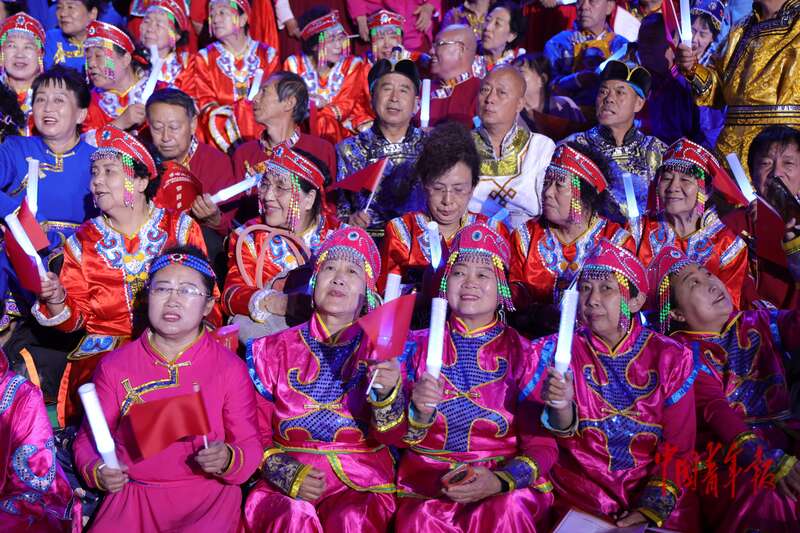 7月29日晚,内蒙古包头市“天下黄河第一村”,内蒙古黄河大合唱主题活动现场,身穿少数民族传统服饰的观众,他们大部分是当地的居民。中青报·中青网见习记者 陈思阳/摄