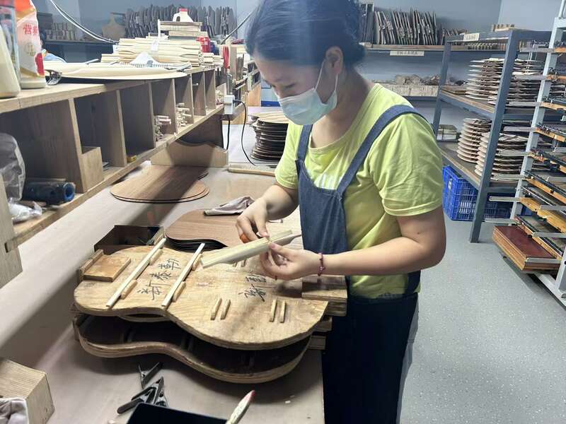 8月28日下午,在湖北桐馨乐器有限公司的生产车间里,32岁的杨剑敏身系围裙,凝神在一张切割好的吉他面板上一根根粘贴立木,接着逐一清胶……“一天下来,平均粘五六十套。”
