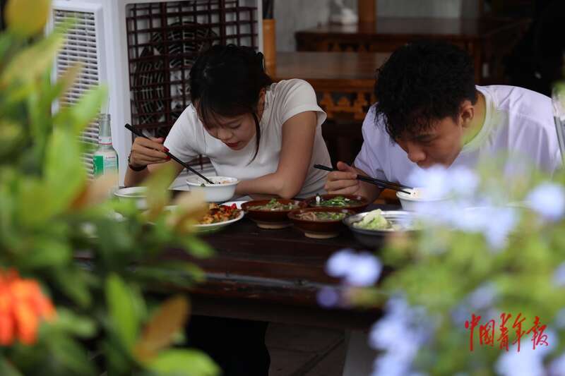 9月2日,四川省乐山市市中区苏稽古镇一家小吃店内,两位年轻人在品尝当地美食跷脚牛肉。苏稽是四川美食跷脚牛肉的发源地,其浓厚的烟火气息深受游客喜爱。中青报·中青网记者 王鑫昕 刘胤衡 摄影报道