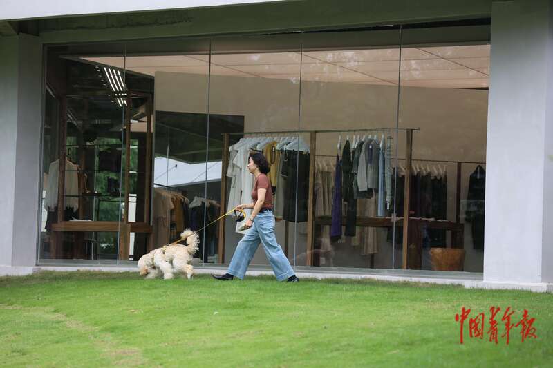 9月2日,四川天府新区麓湖CPI商业公园,一位市民牵着宠物走过一家服装店。中青报·中青网记者 王鑫昕 刘胤衡 摄影报道