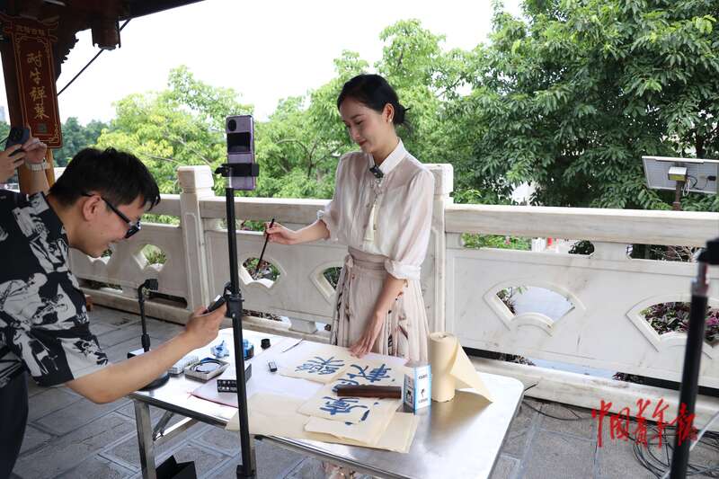 9月2日,四川省乐山市市中区苏稽古镇,一位女士在古镇的廊桥上直播推广书法文化。这位书法爱好者表示,考虑到苏稽古镇人流量大,所以选择到这里直播。苏稽是一个拥有1400多年历史的古镇,也是四川美食跷脚牛肉的发源地,其浓厚的烟火气息深受游客喜爱。中青报·中青网记者 王鑫昕 刘胤衡 摄影报道