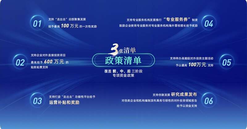 第二张是政策清单。支持企业“走出去”给与最高100万元的一次性奖励,支持企业对外直接投资项目最高给予600万元的贴息贴费、支持打造“走出去”平台给予运营补贴和奖励……在这张清单上,一揽子硬核政策让企业“走出去”实实在在获益。