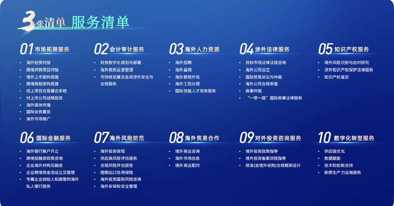 朱莹华说:“其中,第一张是服务清单。”这张覆盖了市场拓展、会计审计、海外人力、涉外法律、知识产权等10个方面的服务清单,几乎解决了企业出海所有的后顾之忧。