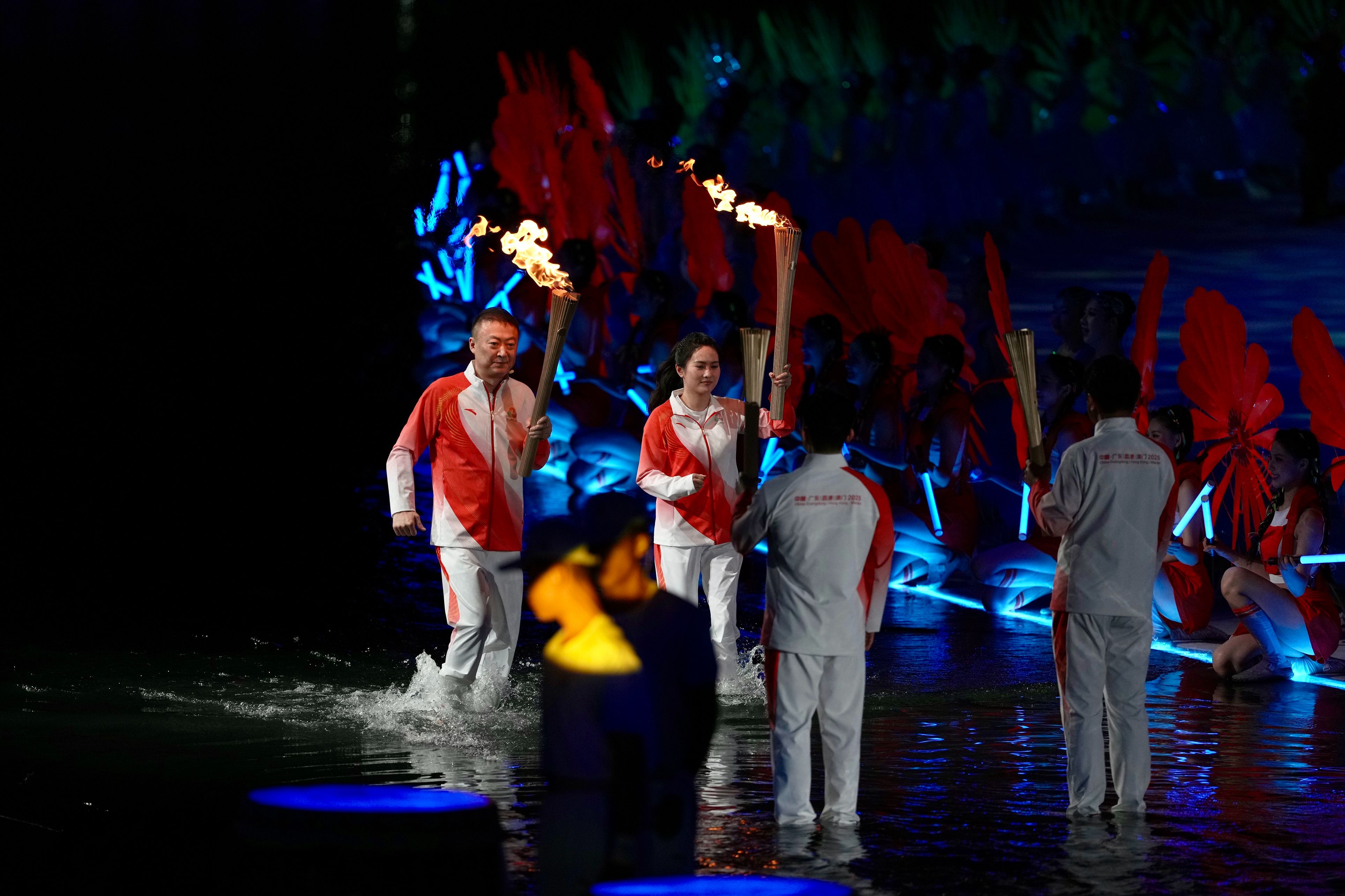 郭晶晶、陈若琳、梁伟铿等来自全国的优秀运动员代表,手持采自南海1522米深处的圣火踏浪而来,最终,男子100米亚洲纪录保持者、广东名将苏炳添,两届奥运会击剑冠军、香港选手张家朗携手来自澳门的第19届亚运会武术长拳金牌得主李祎,共同点燃主火炬。当南海深处的源火之光,化作三地联动的同心之焰,本届全运会展现的将不只是体育的激情,更是一个生机勃勃、携手向前的大湾区。(中青报·中青网记者 梁璇/文 李梓昂/视频 李隽辉/图)