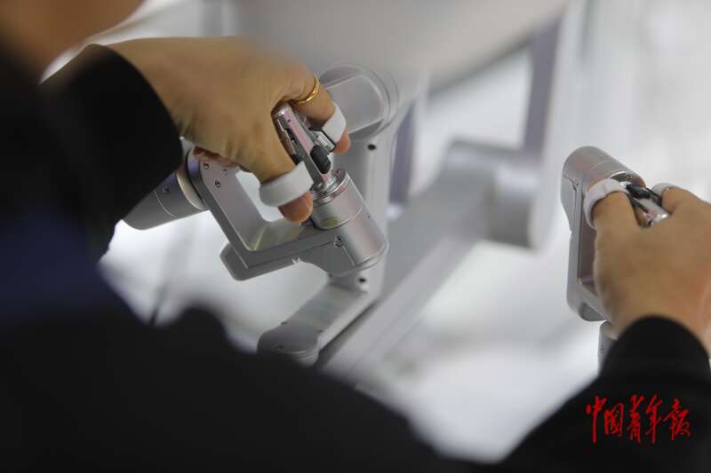 11月10日,上海国家会展中心,第八届中国国际进口博览会医疗器械及医疗保障展区,一名参观者在一家创新型医疗科技企业的展位上体验操作手术机器人。中青报·中青网记者 孔斯琪/摄
