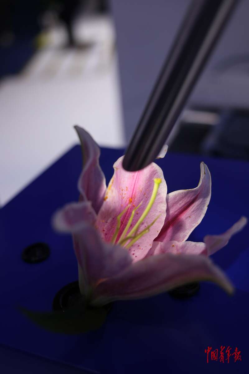 11月10日,上海国家会展中心,第八届中国国际进口博览会医疗器械及医疗保障展区,一家来自德国的医疗科技公司以一朵百合花为例,展示一款电子纵隔镜在人体内探查和活检时的成像效果。中青报·中青网记者 孔斯琪/摄