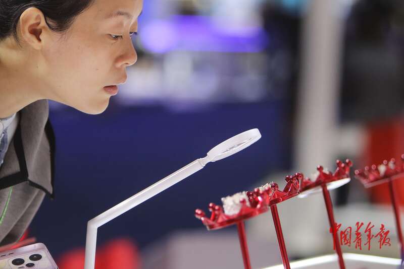 11月10日,上海国家会展中心,第八届中国国际进口博览会医疗器械及医疗保障展区,一名参观者在观看一家美国医学公司制造的人造心脏瓣膜。中青报·中青网记者 孔斯琪/摄