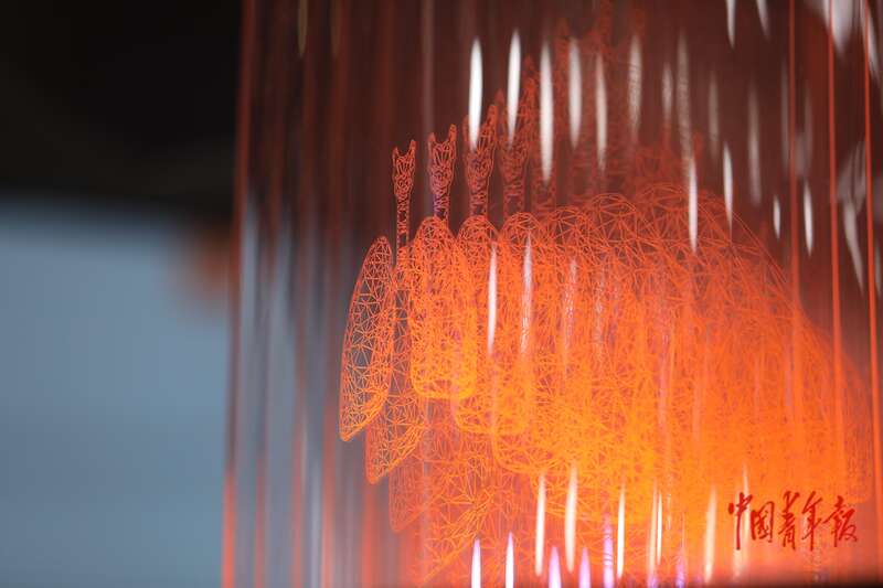 11月10日,上海国家会展中心,第八届中国国际进口博览会医疗器械及医疗保障展区,一家电子公司展位一角,印着人类器官图案的“切片”装置。这家公司提出“数字孪生”的概念,使用实时数据、仿真和建模技术为患者创造一个数字“双胞胎”,可以用于个性化医疗保健,预测甚至预防疾病。中青报·中青网记者 孔斯琪/摄